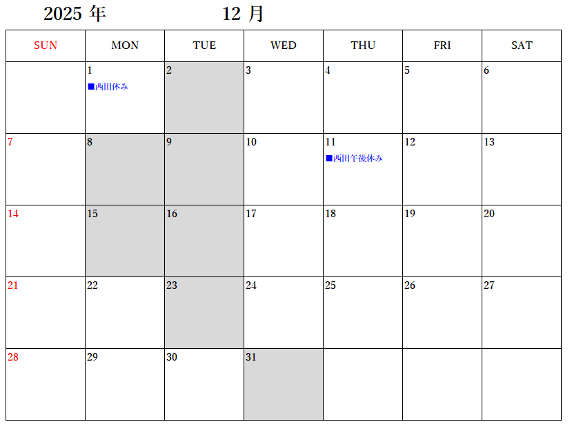 年末年始のお休みは12/31(水)~1/4(日)です。