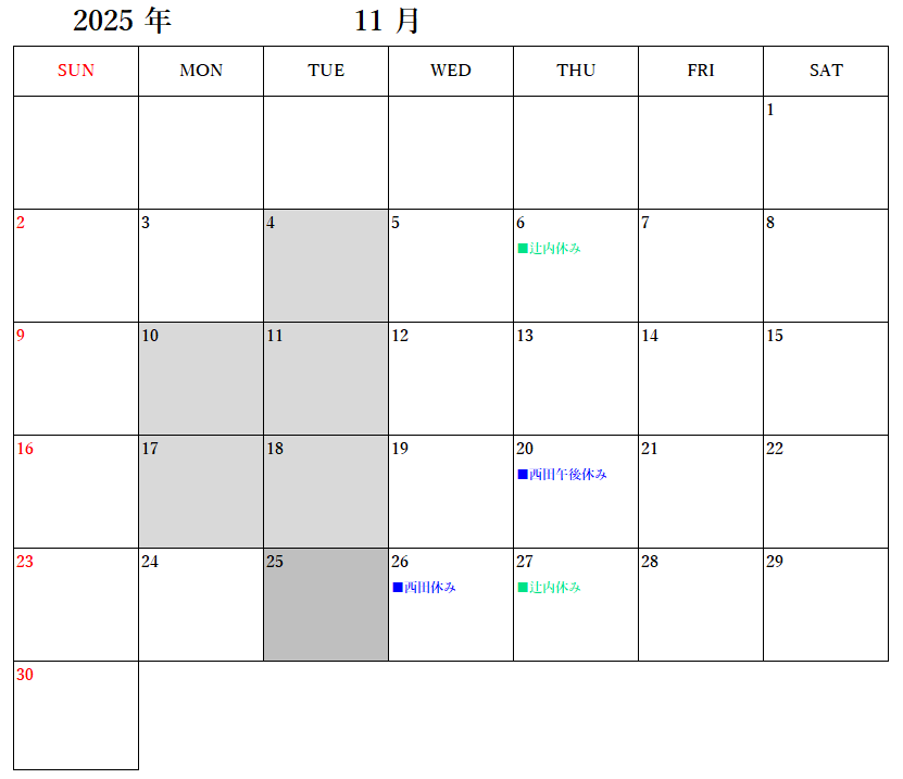 11月のお休みは下記の通りになります。
