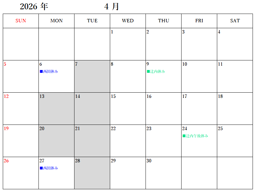 4月のお休みは下記の通りになります。